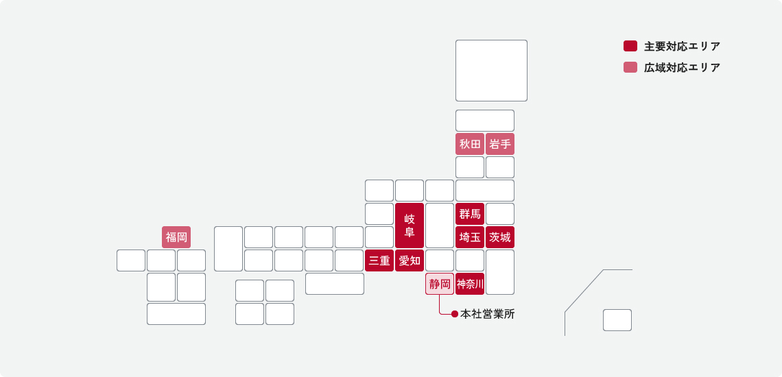 静岡県を拠点に、東海3県(愛知・岐阜・三重)から関東エリア(神奈川・埼玉・茨城・群馬)への輸送を強みとしています。